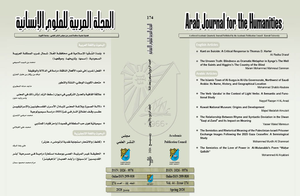كما يضم العدد دراستين باللغة الإنجليزية؛ الأولى للدكتور علي رضا شرف من جامعة الكويت، مناقشًا موقف الفيلسوف (كانط) من الانتحار، ومحاولًا تقديم قراءة مرنة وسياقيّة تتجاوز التفسيرات التقليديّة الصارمة، أما الدراسة الثانية، فتقدمها الدكتورة مرام محمد محمود سمّان من جامعة طيبة، وتتناول (العمى بوصفه استعارة درامية) في المسرح، متحدّيةً الصور النمطية السائدة حول الإعاقة البصرية.