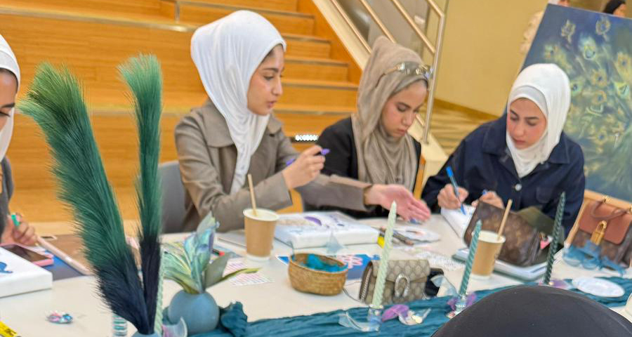 استلهمت الورشة فكرتها من جمال ريش الطاووس وألوانه المبهجة، حيث قامت الطالبات باستخدام درجات اللون التركوازي لتجسيد لوحات فنية نابضة بالحياة عكست تناسق الألوان ودقّة التفاصيل في تعبير رمزي عن الجمال والتفرّد.