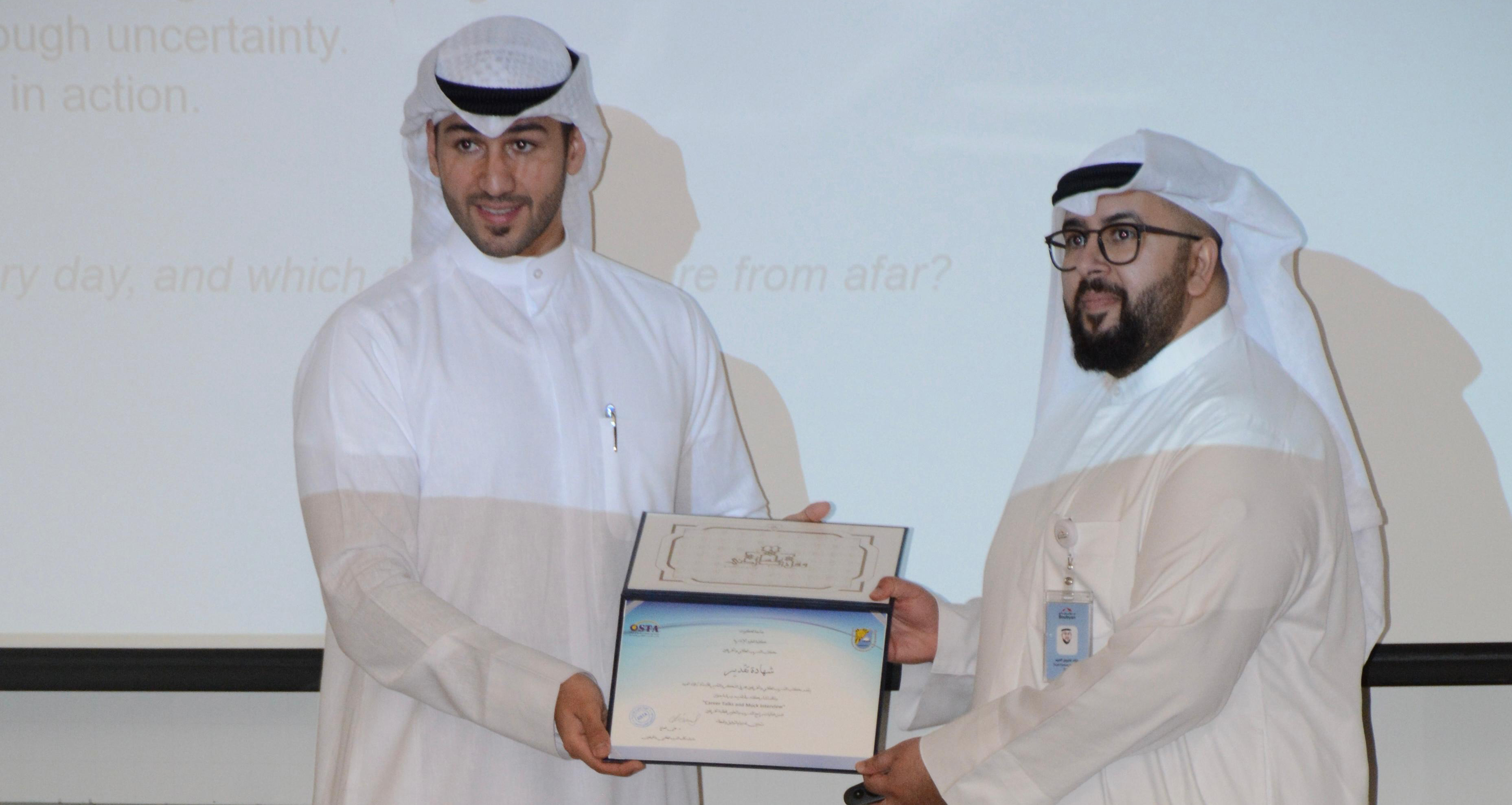 نظّم مكتب التدريب الطلابي والخريجين في كلية العلوم الإدارية بالجامعة، بالتعاون مع بنك بوبيان، الاثنين الماض، ورشة تدريبية بعنوان “Career Talks and Mock Interview” قدّمها فؤاد العبيد من بنك بوبيان، وذلك ضمن سلسلة البرامج والورش التي يقدّمها المكتب لتعزيز جاهزية الطلبة لسوق العمل ورفع مستوى مهاراتهم المهنية.